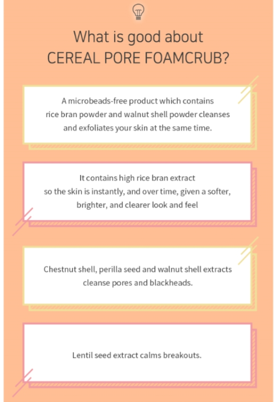 Cereal pore foam crub is good for pore termination, brightening, dead skin cell control and waster relese, blackhead care and trouble skin relating.